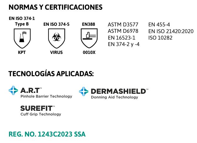 Superficie interior del guante: Recubrimiento de polímero con tecnología DERMASHIELD™.